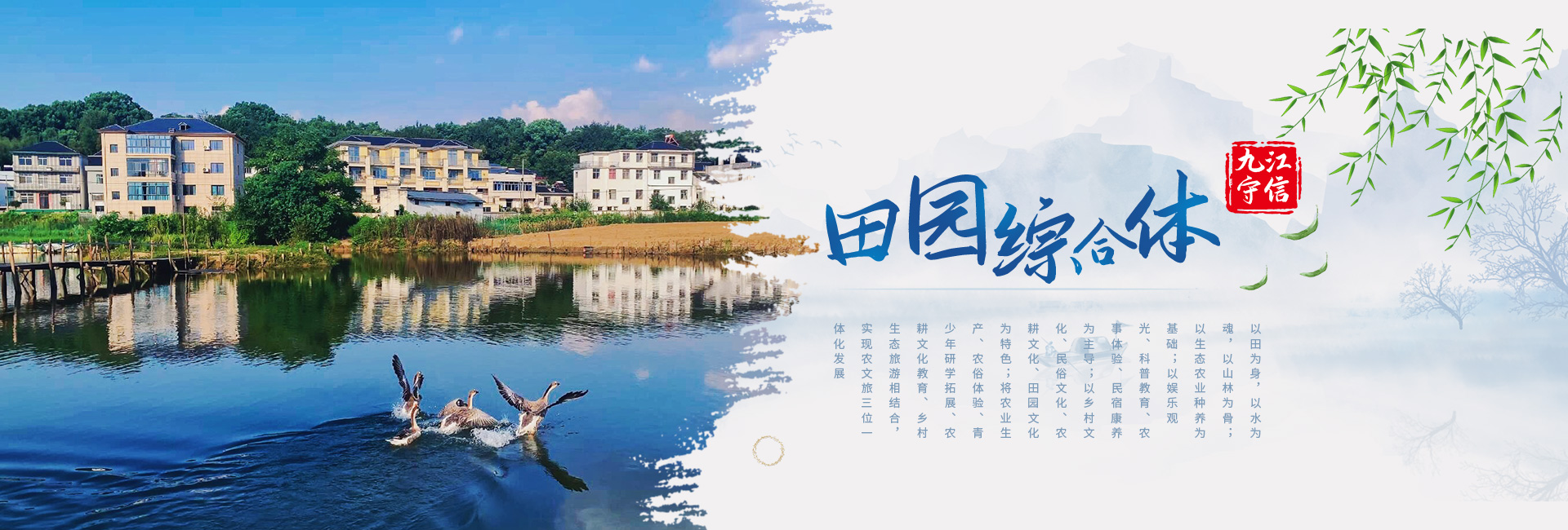 九江守信田園綜合體以田為身,以水為魂,以山林為骨;以生態農業種養為基礎;以娛樂觀光、科普教育、農事體驗、民宿康養為主導;以鄉村文化、民俗文化、農耕文化、田園文化為特色;將農業生產、農俗體驗、青少年研學拓展、農耕文化教育、鄉村生態旅游相結合,實現農文旅三位一體化發展,成為生態性、主題性、復合型農莊公園模式。